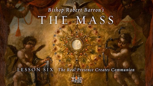 And “‘the Eucharist is the tie that binds us to everybody else.’ Says Bishop Barron, both on earth and in heaven—saints, angels, and martyrs included.” Communion is community. That was especially true historically, as the Church was the gathering of the entire village and the saints.