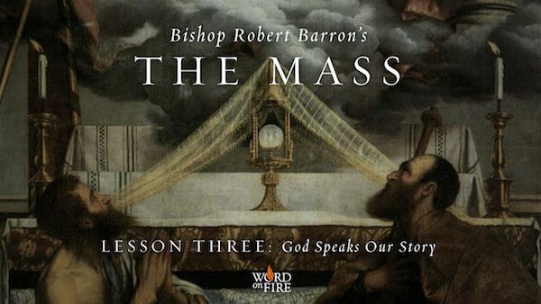 So, in Catholic Mass, during the Liturgy of the Word, we are participating in what Bishop Barron calls “the story of our being drawn evermore into the right praise of God.” As our reading states, that is “the great narrative we all belong to.”